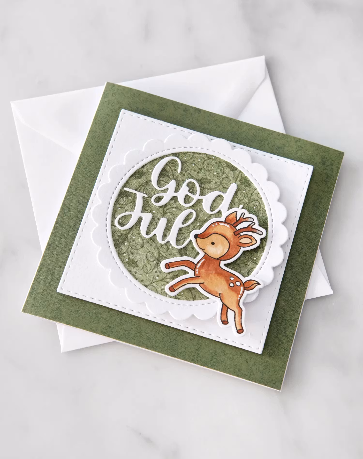 God Jul, en ren med grön bakgrund. 10x10cm.